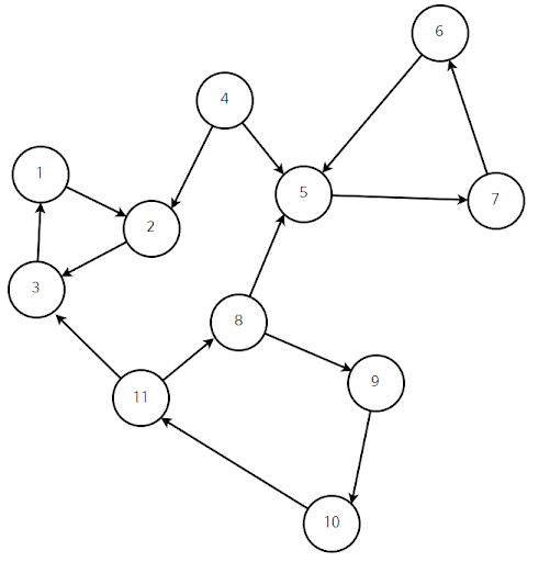 총 4개의 집합이 존재하는데 각 집합에 있는 정점끼리는 서로에게 도달할 수 있는 것을 알 수 있다. 사이클이 발생하는 경우 무조건 SCC에 해당한다는 특징이 있다. 그래서 위와 같이 방향 그래프일 때만 의미가 있다. 무향 그래프라면 그 그래프 전체는 무조건 SCC이기 때문이다.