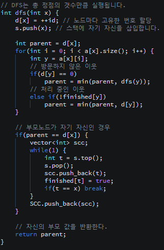 타잔 알고리즘은 모든 정점에 DFS를 수행하여 SCC를 찾는 알고리즘이다. 부모로 돌아올 수 있어야 SCC가 성립될 수 있다. 구체적으로 이것을 검증하기 위해 부모에게 자식으로 나아가는 알고리즘으로 DFS 알고리즘이 사용되는 것이다.