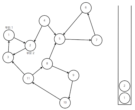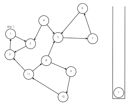 그 다음, 정점 2에 대한 DFS 함수가 끝나고 정점 1의 부모 값은 정점 2에서 건너온 부모 값 1과 비교해서 동일하게 1이므로 유지됩니다. 이후에 함수가 마치면서 1의 부모 값은 자기 자신과 동일하기 때문에 '아 내가 SCC의 부모에 해당하는 것이었구나' 파악한 뒤에 스택에서 자기 자신이 나올 때까지 뽑습니다.