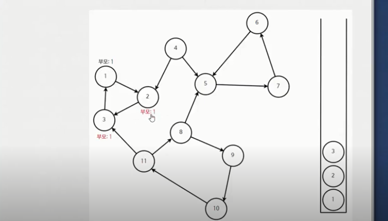 정점 3을 기준으로 DFS를 수행할 때 연결된 정점 1을 확인한다. 이 때 정점 1의 DFS가 끝나지 않은 상태이므로 여기에서 정점 3은 '아, 나의 부모가 정점1이구나'하고 파악한다.