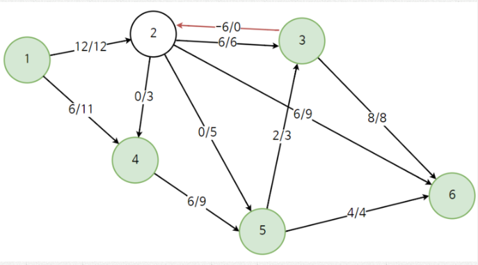 2에서 3으로 6만큼 흐로고 있다는 것은 사실 3에서 2로 -6만큼 흐르고 있다고 볼 수 있다. 물론 실제로는 불가능한 이야기이므로 용량은 6이고 유량이 -6인 것처럼 기록됩니다. 이러한 기억을 하는 이유는 바로 남아있는 모든 가능한 경로를 더 찾아내기 위해서 입니다. 이렇게 음의 유량을 기록하게 해주게 되면 다음과 같이 새로운 경로를 찾을 수 있습니다.