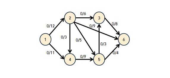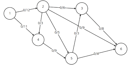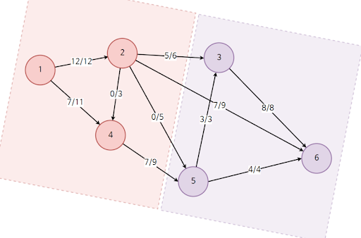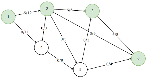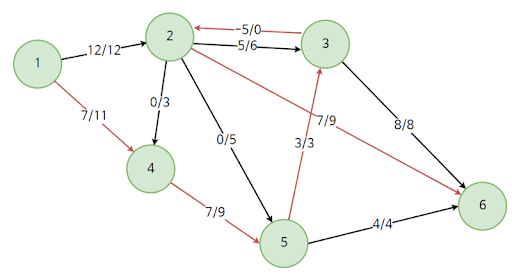 표현 방식은 유량(Flow)/용량(Capacity)이다. 즉 1에서 2로 가는길은 12명이 갈 수 있는 용량에 실제로는 0명이 가게 되었다는 소리이다.
