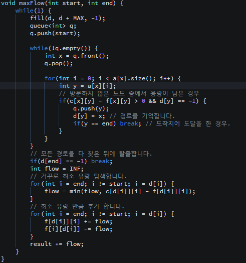 기본적으로 BFS를 사용해서 모든 가능한 경로를 다 찾아서 남아있는 용량만큼 유량을 흘려 보내주는 것을 반복하면 된다. 그 과정에서 앞서 설명한 대로 음읭 유량도 함께 처리를 해주기만 하면 된다.