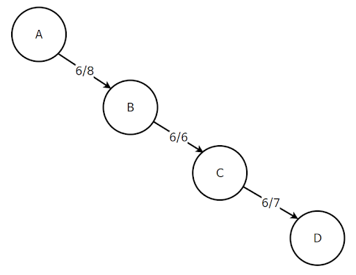 이제 간단하게 하나의 간선으로 용량과 용량을 표현해보면, 위와 같이 A에서 B로 갈 수 있는 용량은 8, B에서 C로 갈수 있는 용량은 6, C에서 D로 갈 수 있는 용량은 7이라고 해보자. 이때 A에서 D로 최대한 많은 용량을 보내려고 할 때 가장 합리적인 양은 얼마일까?