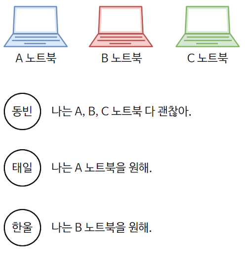 효과적으로 매칭시켜준다는 말은 다시 말해 '최대 매칭(Max matching)'을 의미하는 것입니다. 모든 사람 각각이 노트북을 선택하여 가장 많이 연결되는 경우를 찾는 문제라고 볼 수 있습니다. 그림을 한번 다음과 같이 플로우로 표현해보도록 합시다. 네크워크 플로우와 정확히 일치하게 됩니다.