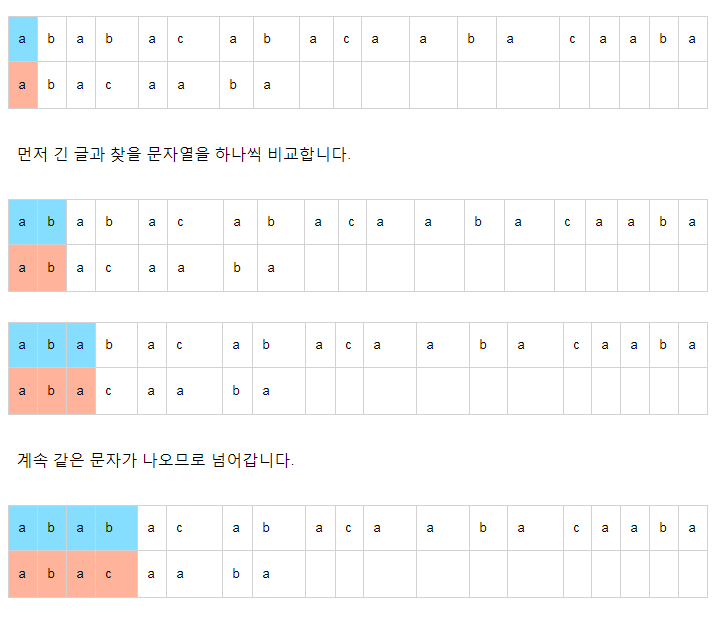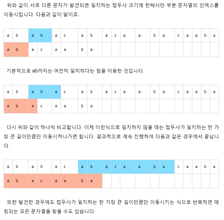 // 일치했던 부분까지 되돌아가서 다시검사를 하는 방식으로 빠르게