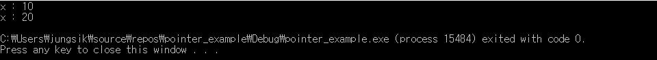 // 현재 가리키는 대상 메모리는 변수 x의 메모리이므로 x의 값은 20이 된다.